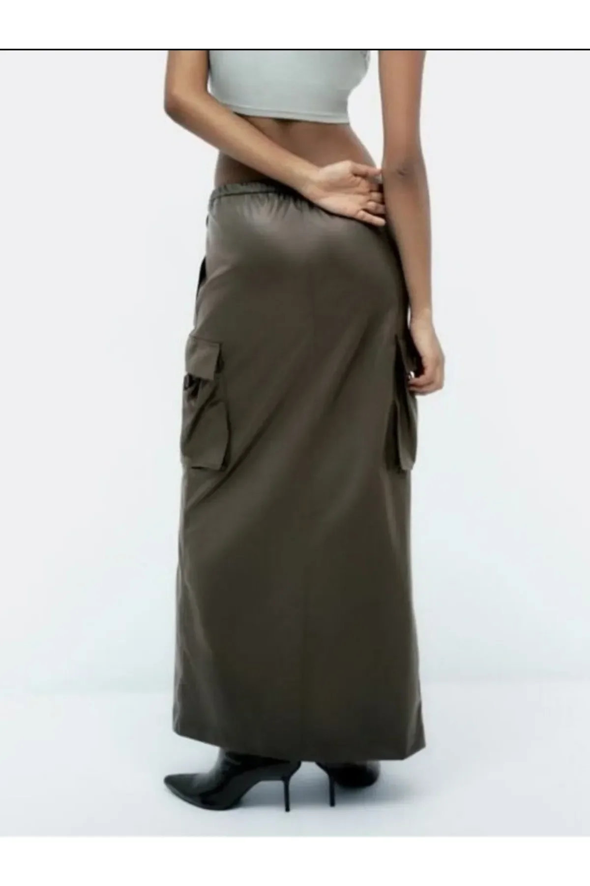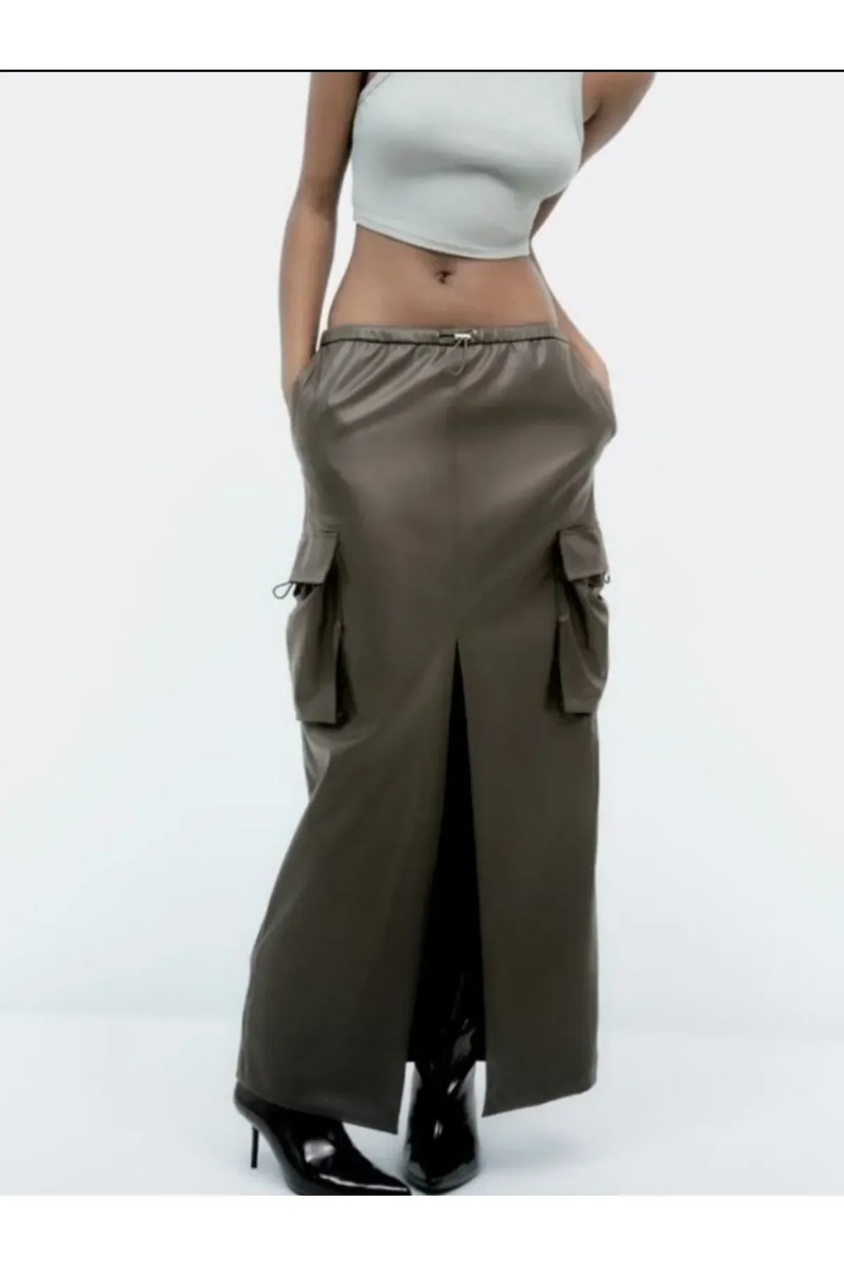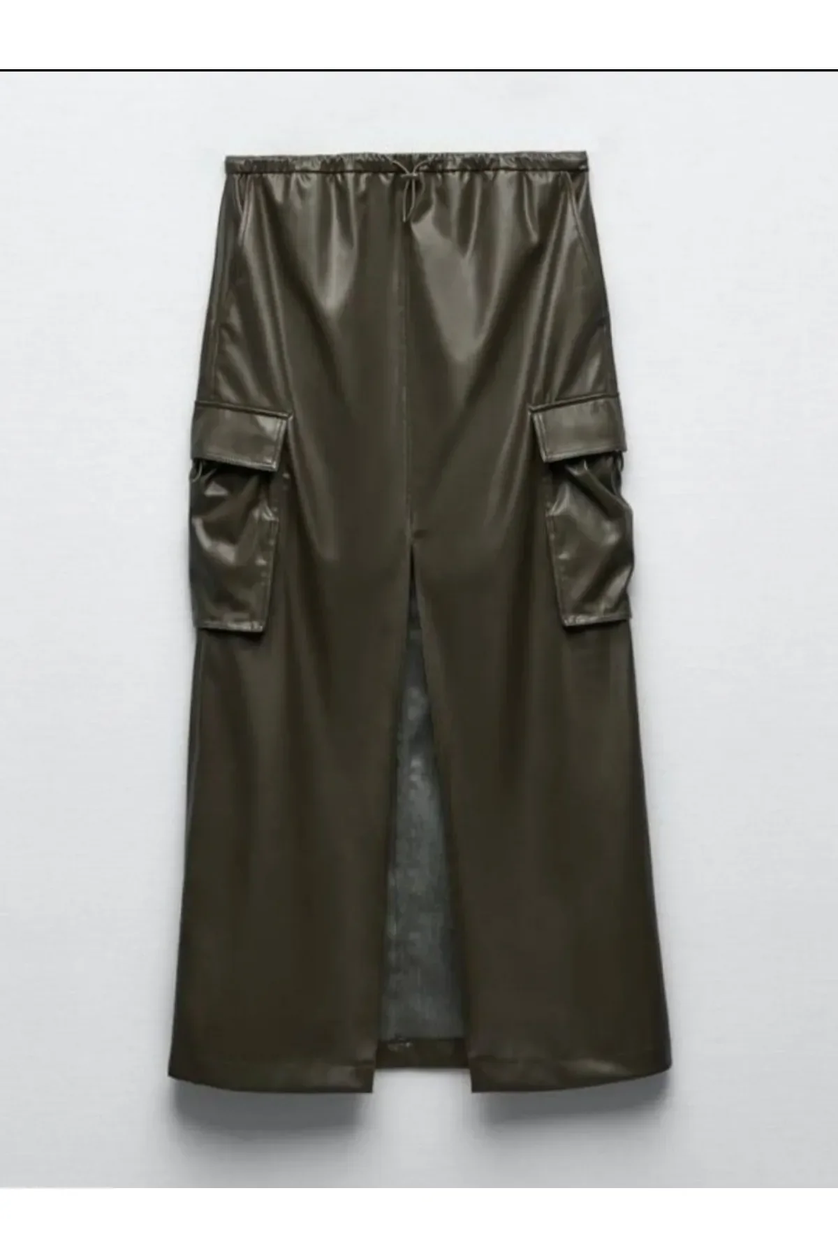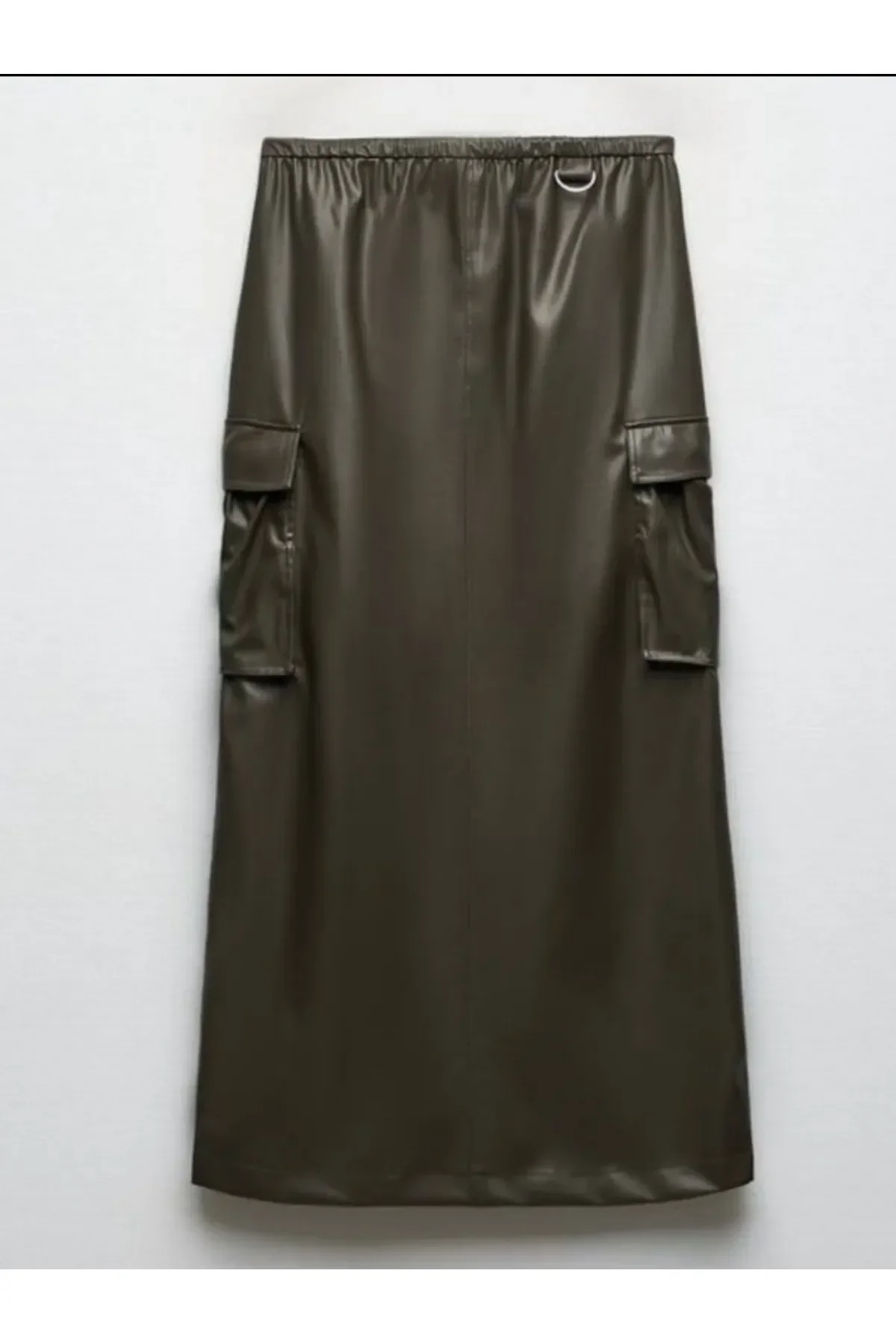 Zara Suni Deri Yırtmaçlı Uzun Kargo Etek ABZRA0116